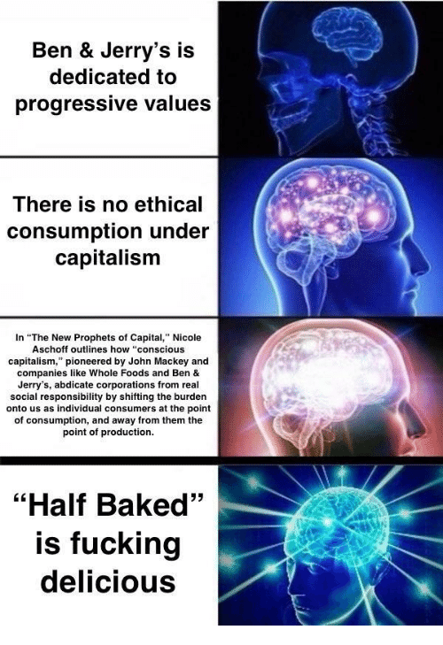 In "The New Prophets of Capital," Nicole Aschoff outlines how "conscious capitalism," pioneered by John Mackey and companies like Whole Foods and Ben & Jerry's, abdicate corporations from real social responsibility by shifting the burden onto us as consumers at the point of consumption, and away from them at the point of production.